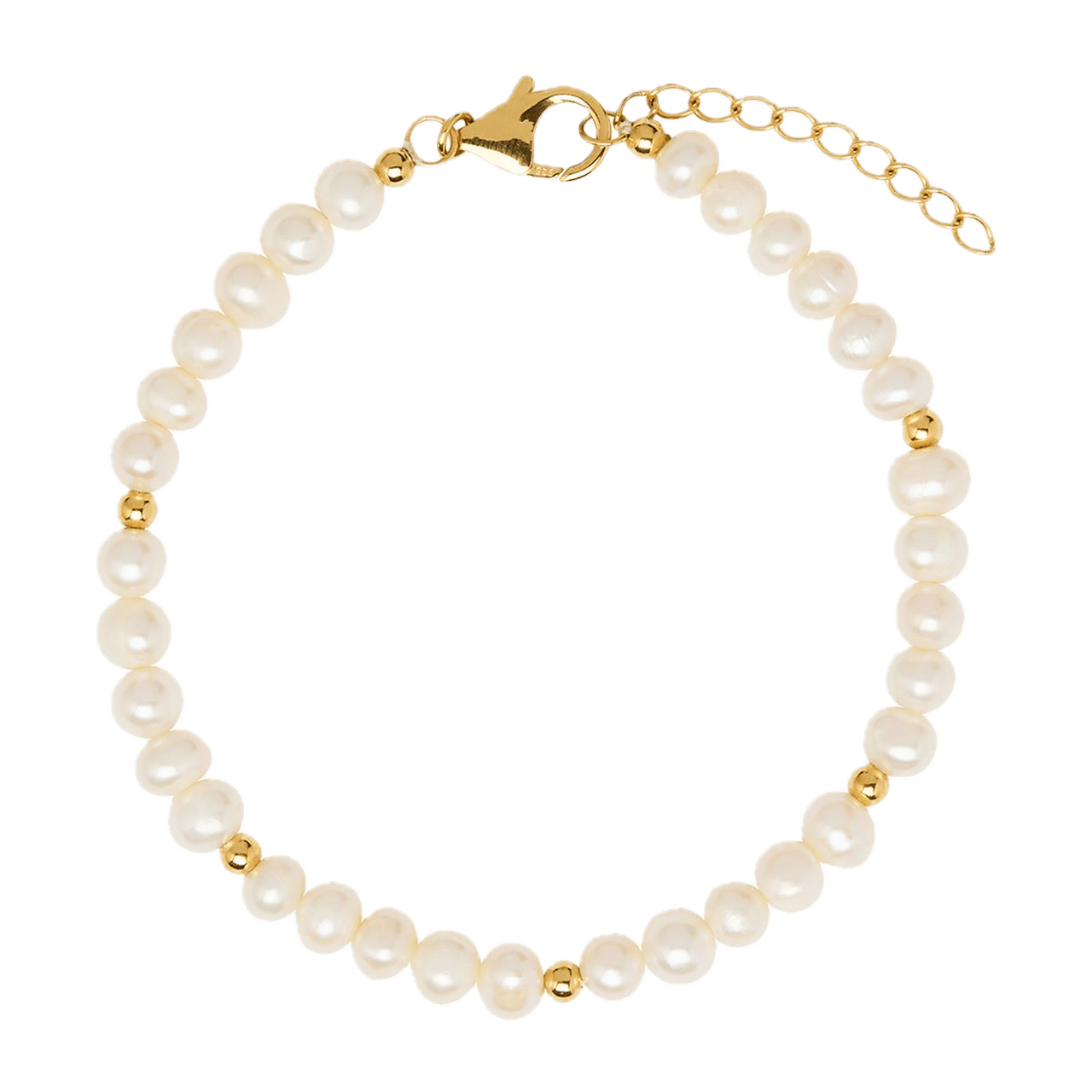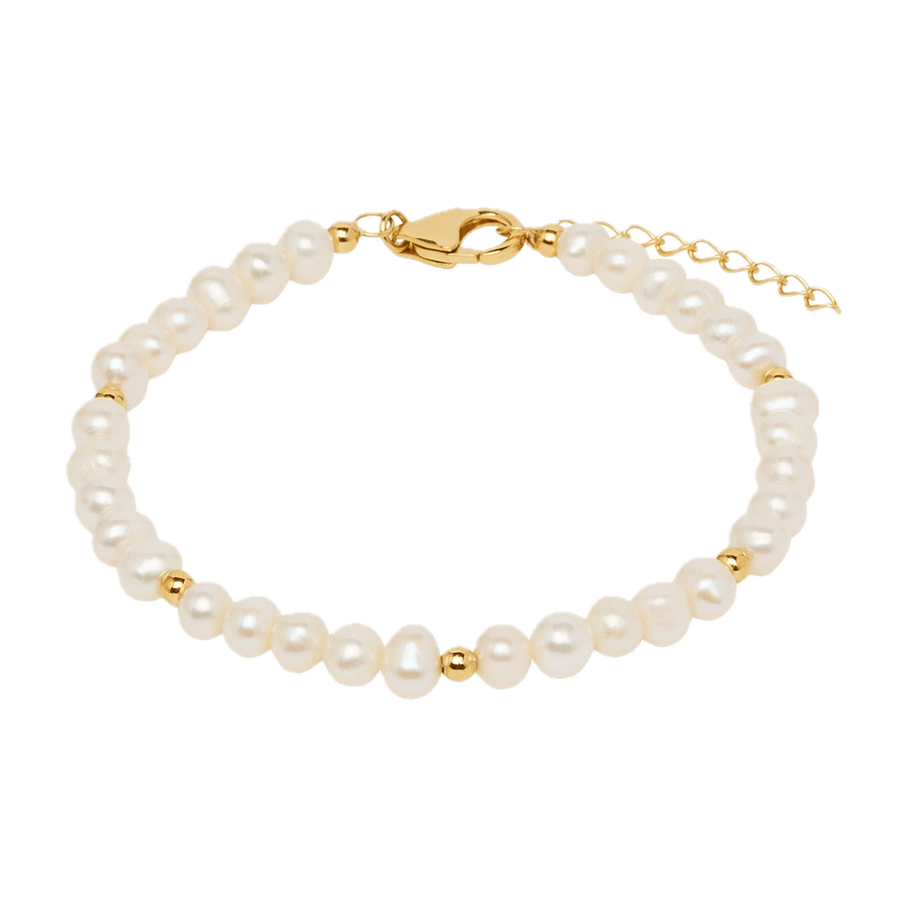 Najo's freshwater pearl bracelet combines timeless elegance with everyday wearability. Featuring a lustrous 5mm round freshwater pearl as the focal point, it's paired with delicate 3mm yellow gold-plated silver beads for subtle sophistication. The 19cm bracelet extends to 22cm with an adjustable extension, ensuring a comfortable fit for most wrists. Crafted with antitarnish protection, this piece maintains its radiance through regular wear, making it an effortless addition to your jewellery collection.