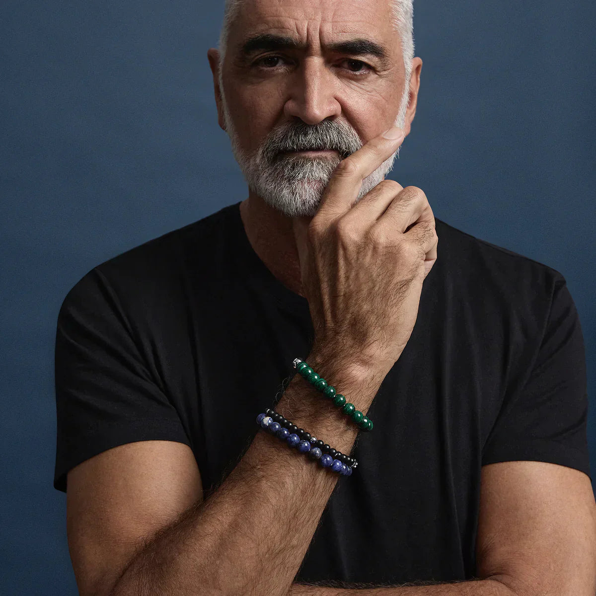 Inspired by the titan who held the heavens, the Atlas bracelet commands attention with uncompromising style. Ten millimetre rounds of deep navy sodalite or black onyx —streaked with silvery-white—anchor the design, punctuated by a single steel accent that cuts through with urban edge. Sodalite merges intuition with logic, believed to settle a restless mind. Wear it as a power statement over tailored suiting or let it ground casual linen with cool, deliberate confidence. A bracelet for men who refuse to choose between substance and style.