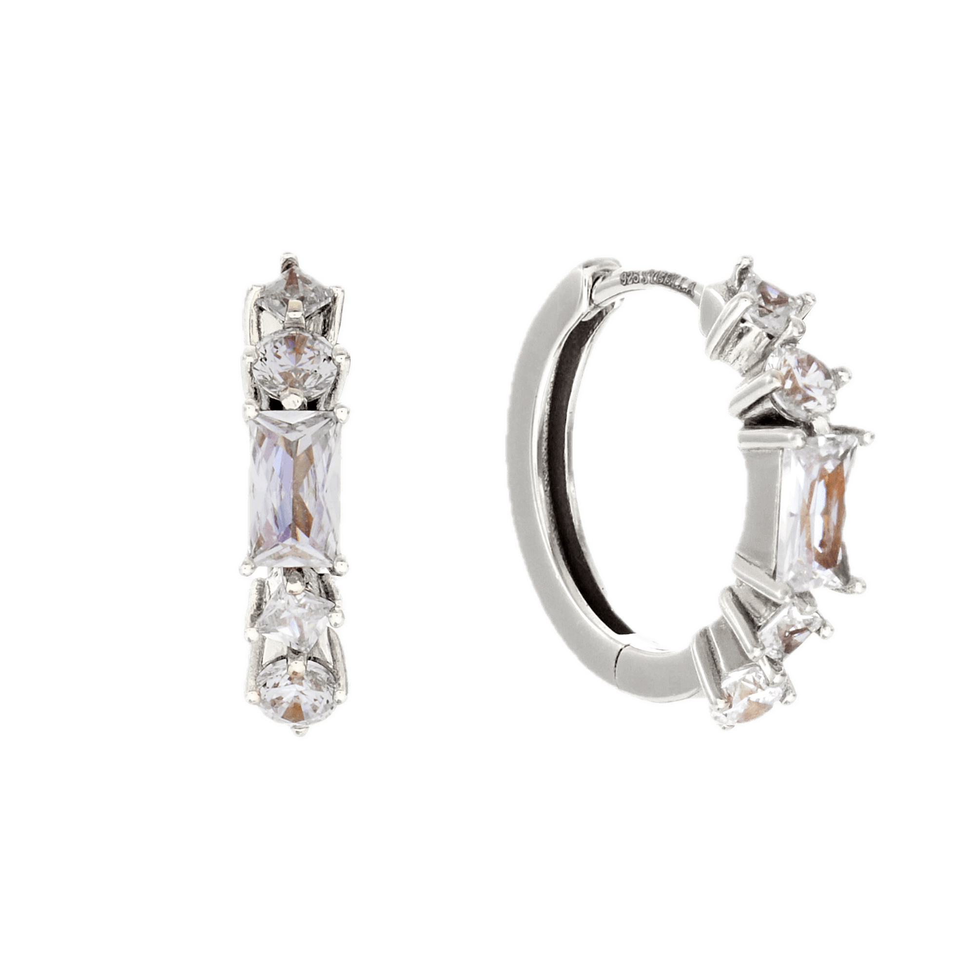 Elevate your collection with the Sybella Luella Rhodium Plate Multi Shape CZ Hoop Earrings. These refined hoops feature a blend of sparkling cubic zirconia in varied shapes, all set on a polished rhodium-plated frame. Their sophisticated design adds subtle brilliance to any ensemble, perfect for both elegant occasions and everyday wear.