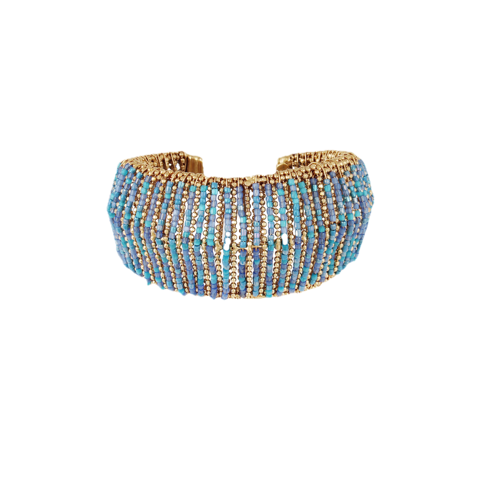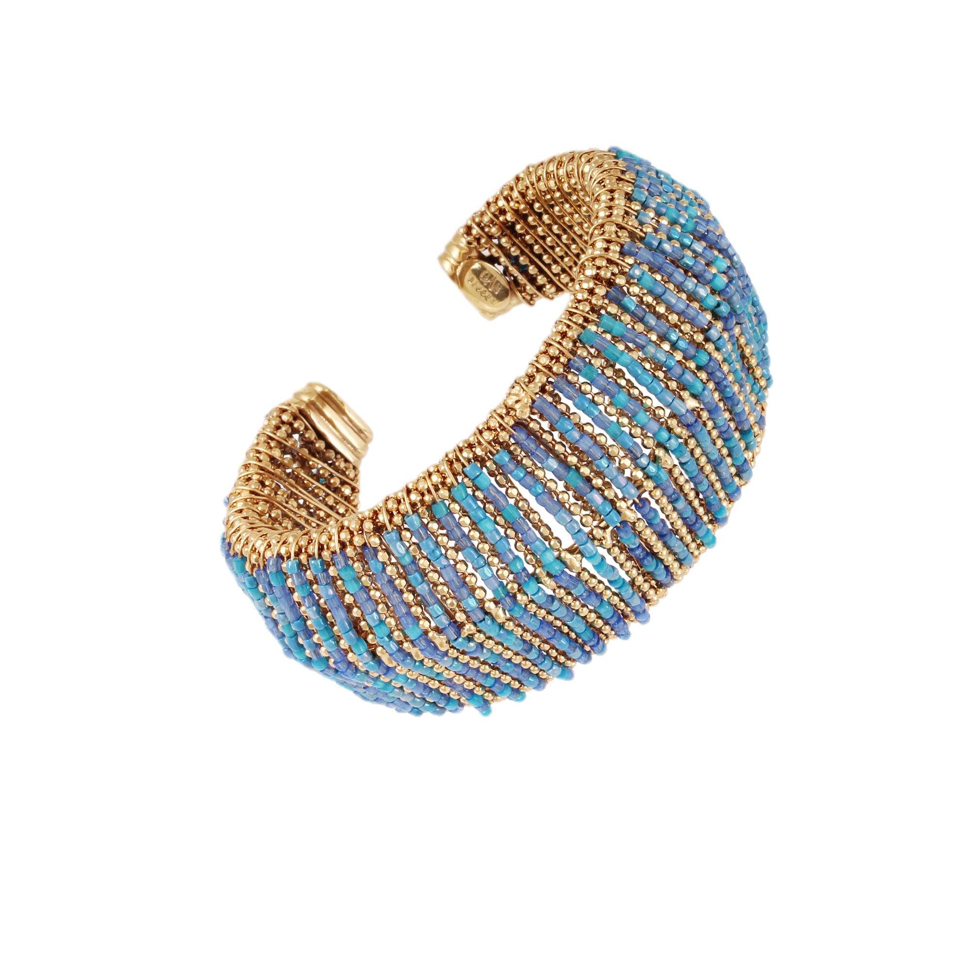 The Gas Bijoux Izzia Cuff is the perfect way to add an air of luxury and sophistication to any ensemble. Crafted from a gold-plated bracelet base composed of threads and golden beads and accented by elegant blue beads, this one-of-a-kind piece is sure to make a statement.