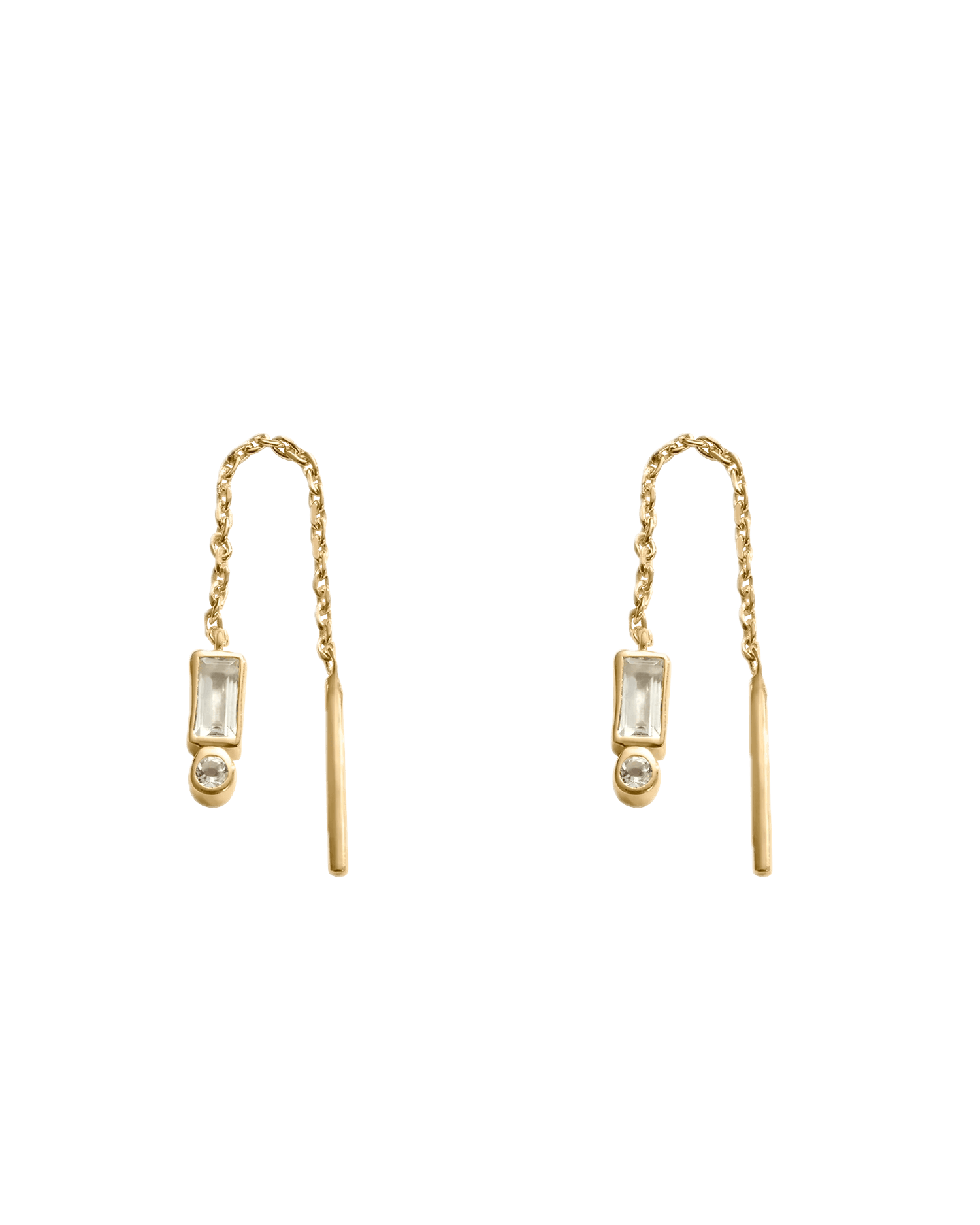 Elevate your ear stack with the Vantage Topaz Threaders, where refined elegance meets effortless movement. Crafted in luxurious 18k gold plating or Sterling Silver these threaders showcase a striking white topaz baguette paired with a delicate circular topaz accent. The fluid, elongated design allows the fine chain to thread gently through your ear, anchored by a graceful threader bar. Perfect for layering with hoops or wearing solo, they add a whisper of sophistication and gentle motion to your everyday aesthetic.
